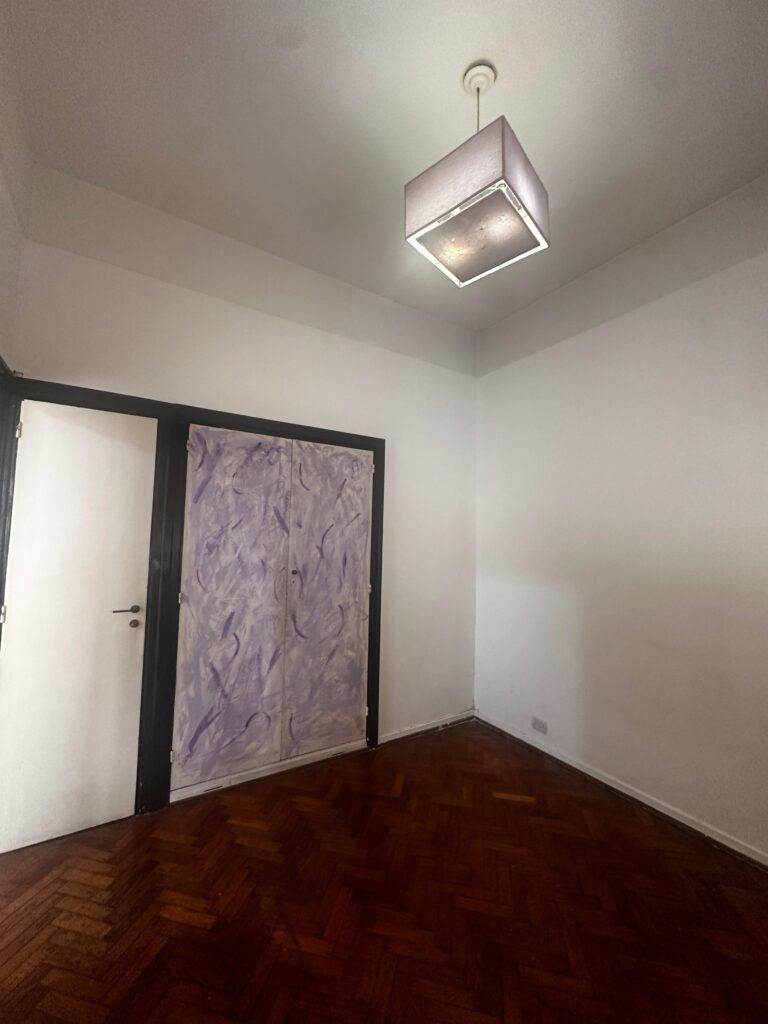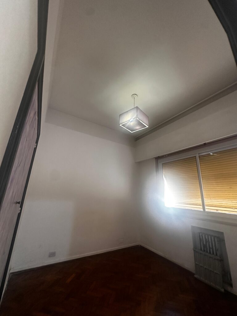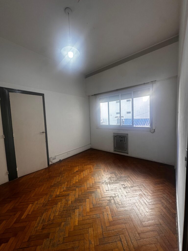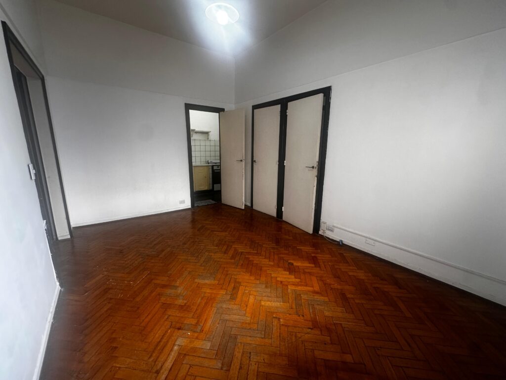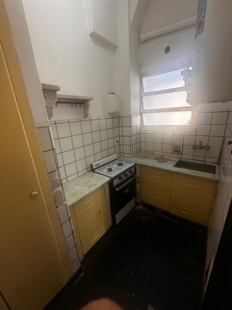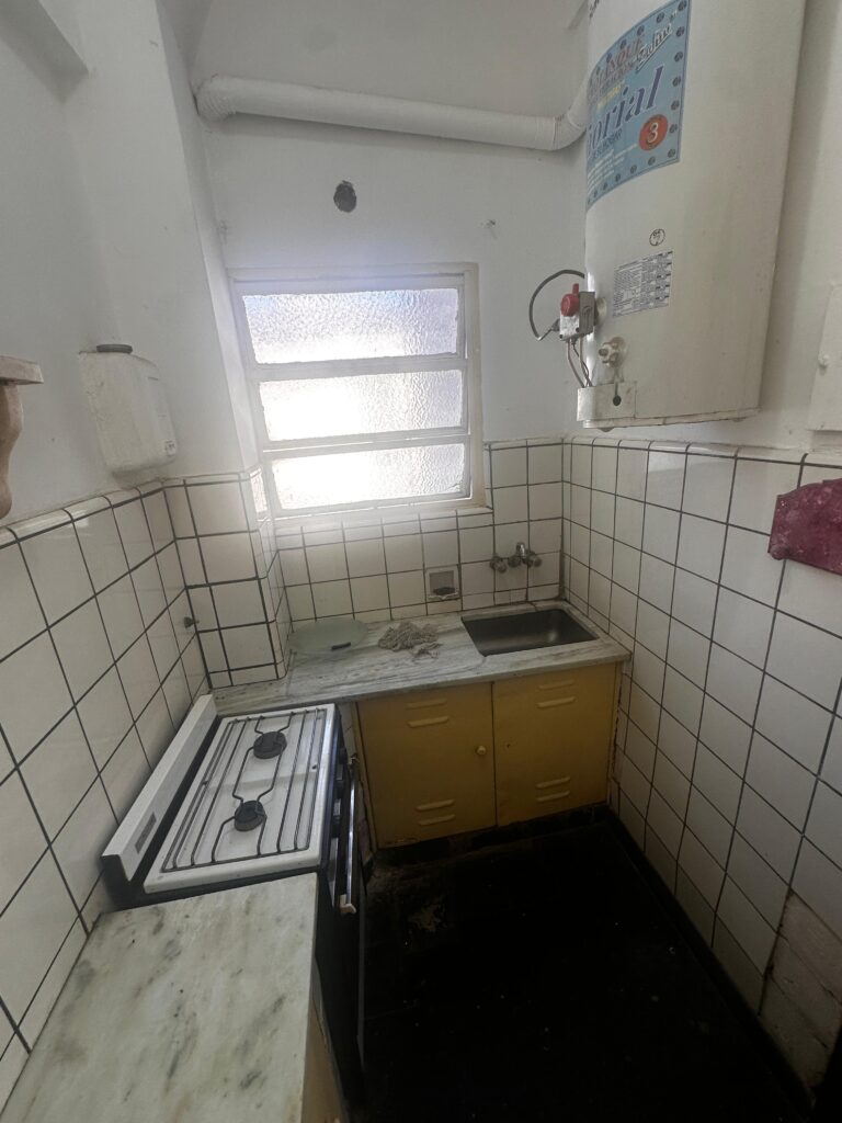 El dormitorio es independiente y posee placard integrado, brindando buen espacio de guardado. La cocina es a gas y equipada con calefón, manteniendo el carácter funcional del departamento.